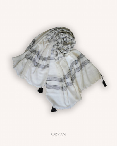 شال زنانه نخی سفید با خطوط مشکی | طرح ساده و کلاسیک