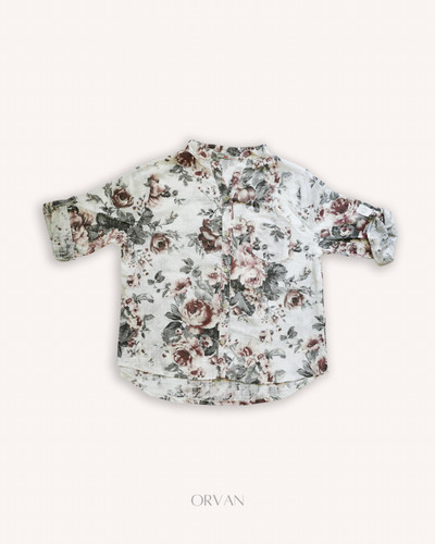 شومیز گلدار زنانه با پارچه لینن ایتالیایی | زمینه سفید و یقه گرد